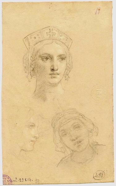 Testina femminile incoronata con diadema romanico e altre testine. figure femminili