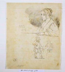 Schizzo di mezza figura di donna e in basso impressioni di figurine settecentesche. figure femminili