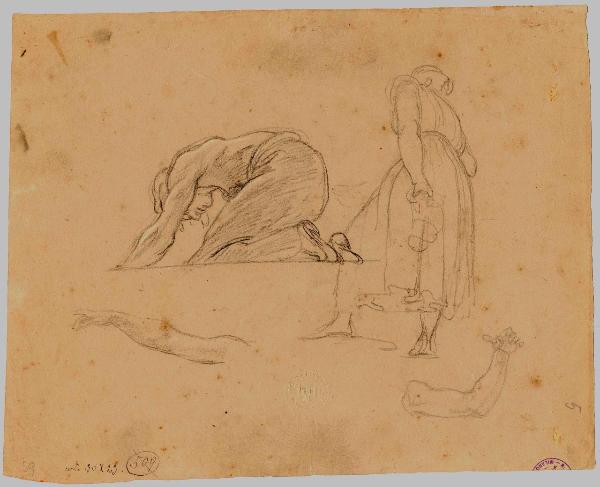 Studio di donna chinata e altra all'impiedi vista di lato. figure femminili