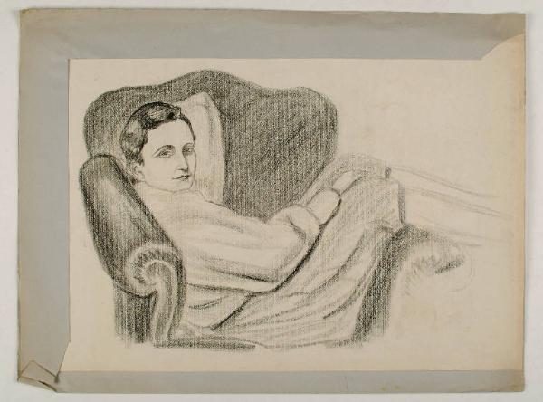 Ritratto di giovane donna dai corti capelli neri, seduta di traverso su una poltrona, con le spalle appoggiate al bracciolo destro e le gambe penzolanti oltre quello sinistro. Il suo corpo è ripreso di profilo mentre la testa, appoggiata ad un cuscino chiaro, è ruotata verso l'osservatore in modo da mostrarsi quasi frontalmente. La mano sinistra è portata dietro la nuca in prossimità dell'orecchio destro, mentre la mano sinistra è appoggiata tra le ginocchia. La donna indossa un vestito dalle ampie maniche, stretto in vita,che scende appena sotto le ginocchia. Il disegno, che modella la forma, è realizzato a matita nel volto e poi completato e rinforzato a carboncino, come nella pelle nera della poltrona, nei capelli, dove disegna l'andamento delle ciocche nere, nel viso dove marca il profilo delle labbra e delle arcate sopraccigliari. Anche il corpo è delineato con una pesante linea nera che descrive anche la vita e l'ombra del braccio destro sul vestito.