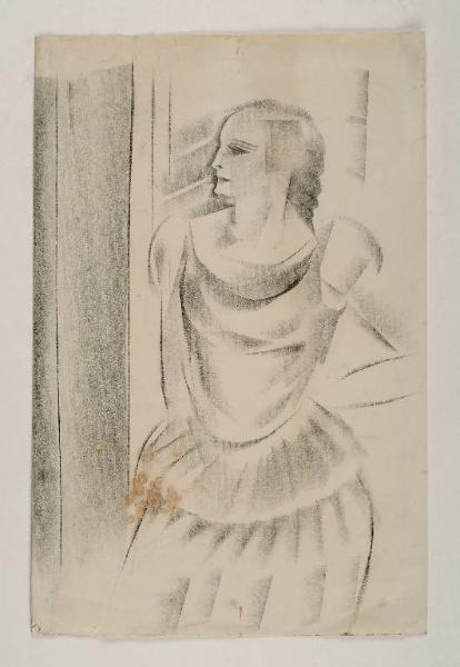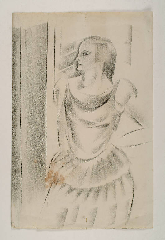 - NOTIZIE STORICO CRITICHE Lo stile grafico è caratterizzato da rapide e precise linee di contorno che, seppur nell'evidente abbreviazione, definiscono plasticamente la forma del corpo e le pieghe dell'abito. L'ombreggiatura ha un andamento geometrizzante e tende a travalicare i contorni con un'accentuazione scompositiva di derivazione cubofuturista. Il profilo del viso è definito da una precisa linea di contorno scura, rinforzata da un'ombra portata a carboncino./\nIl taglio dell'abito, dalle linee arrotondate alle spalle ed ai fianchi, stretto in vita e morbido sul busto, spingerebbe ad una datazione dai secondi anni trenta ai quaranta, così come il taglio dei capelli, che scendono fino alle spalle. Le caratteristiche formali e compositive del disegno indicherebbero una collocazione agli ultimi anni venti o ai primi anni trenta.