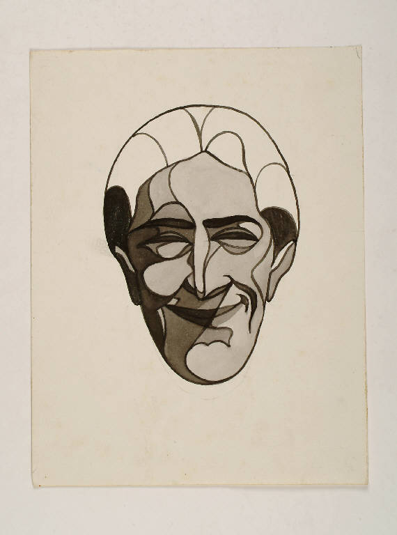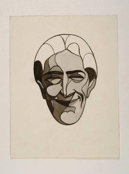 Il volto di un uomo sorridente è ripreso frontalmente,\nsu fondo bianco. Il profilo del viso è ovale e gli occhi sono socchiusi. La tecnica grafica è a tinte piatte che variano, dal bianco al nero, su una scala di cinque grigi , realizzati ad acquerello e ad inchiostro steso a pennello. I campi sono circoscritti da una linea di contorno nera ad andamento curvilineo che modella geometricamente la forma. La diversa gradazione tonale del colore nei campi descrive le ombreggiature del viso e ne rompe la strutturazione simmetrica.