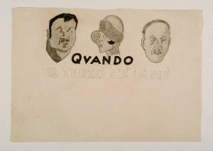 Nella parte alta del foglio i volti caricaturati di tre personaggi sono disposti lungo una linea orizzon=\ntale. Immediatamente più in basso compare l'iscri= zione su due livelli il cui disegno, realizzato a matita,\nè ancora visiblile sotto l'inchiostro utilizzato per ri=\npassare la parola "QUANDO". La seconda parte della scritta è lasciata a matita così come a matita sono le linee d'appoggio orizzontali per i caratteri a\nstampatello. Le tre caricature sono realizzate con colore diluito, steso a pennello su un disegno preparatorio a matita. A sinistra compare il volto di un uomo corpulento con capelli e baffi neri. Al centro il viso, di tre quarti verso sinistra, di una giovane donna con cappellino. A destra è disegnato il volto truce di un personaggio con capelli chiari e corti baffetti. Il disegno, dallo stile umoristico e satirico, è stato evidentemente iniziato e non concluso.