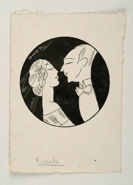 Entro un tondo, con sfondo dipinto ad inchiostro nero, è ritratta, a risparmio, una coppia di sposi ripresi di profilo a mezzo busto. Lei, a sinistra, indossa l'abito bianco ed il velo nuziale, mentre lui, a destra, veste un abito scuro da cerimonia, con camicia bianca e papillon. Le due figure, eleganti e stilizzate, sono ben rappresentative della cifra grafica dell'illustratore foggiano Umberto Onorato. Sono immagini scattanti, sinuose ed allungate che rimandano al gusto decorativo degli anni Trenta e ricordano,pur nell'evidente impronta caricaturale, gli allungamenti anatomici di un Modigliani.