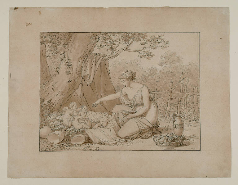 - NOTIZIE STORICO CRITICHE L'opera veniva precedentemente identificata come " Leda e i gemelli Castore e Polluce ed Elena e Clitemnestra", mentre dagli studi effettuati in occasione della mostra del 2003 (CASARIN, 2003, p.172) è emerso che si tratta di una rappresentazione della nascita degli Amorini, iconografia poco diffusa e legata a quella del "mercato degli amorini", testimoniata nella raccolta da un'altra tavola che rappresenta le medesime caratteristiche stilistiche e tecniche di quella presa in esame, fomando con essa un ciclo unitario (vd. 0300144673).