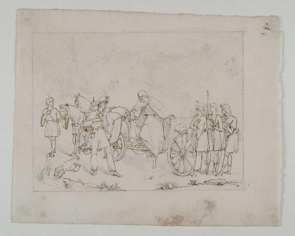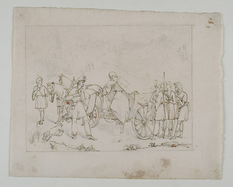 - NOTIZIE STORICO CRITICHE Il disegno rappresenta un episodio narratto dagli Atti degli Apostoli (8, 26-40), in cui si narra del battesimo del ministro della regina etiope Candace ad opera di Filippo. La particolare iconografia, concentrata sulla discesa dal carro dell'apostolo e non sulla scena del battesimo, rende meno facilmente riconoscibile il tema, più volte sperimentato in ambito purista (CASARIN, 2003, pp. 168-169), ad esempio da Woldemar Friedrich Olivier .Nella collezione del museo Bellini esiste un altro disegno con le medesime caratteristiche tecnico-stilistiche che raffigura il momento successivo al battesimo, il rapimento di Filippo da parte dello Spirito Santo (vd. 0300144686); forse entrambi facevano parte di un ciclo più ampio. Per entrambi in passato è stata ipotizzata un'attribuzione a Luigi Impaccianti.