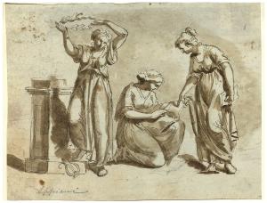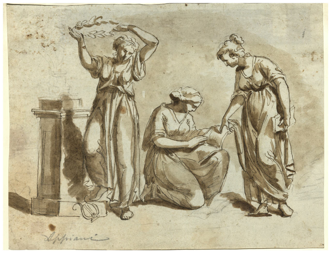 - NOTIZIE STORICO CRITICHE Il piccolo studio colpisce per l'atteggiamento spontaneo con cui sono raffigurate le Muse. Il carattere anticonvenzionale che l'artista ha adottato nella rappresentazione delle figure mitologiche può aver spinto Precerutti Garberi (1969) a datare questo disegno al periodo giovanile di Appiani; tuttavia la natura "settecentesca" della scena suggerisce di attribuire il foglio a un anonimo autore italiano della fine del XVIII secolo.