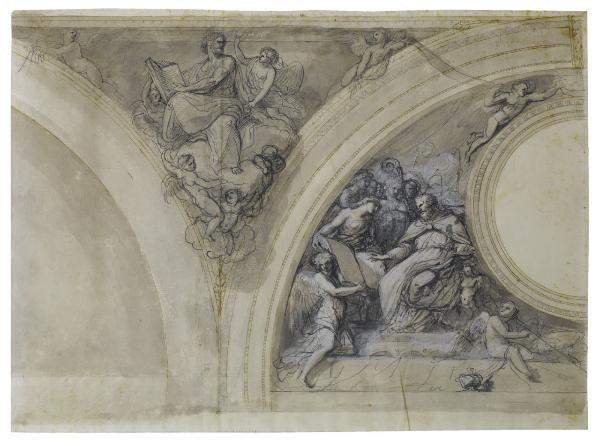 - NOTIZIE STORICO CRITICHE Il disegno è ritenuto autografo dalla Brizio (1975) ma con integrazioni di altre mani; è plausibile che ad Appiani sia spettato il primo sviluppo mentre i suoi collaboratori intervennero successivamente. L'autore studia, nel complesso, la struttura compositiva della decorazione, i rapporti con la partizione architettonica cui era destinata e gli effetti chiaroscurali. Pur ritenuto dalla critica di qualità inferiore rispetto ai cartoni o agli studi preparatori, va, tuttavia, rimarcata l'abilità dell'autore di costruire plasticamente le figure con pochi segni, mentre i rialzi in biacca per evidenziare le accensioni luministiche potrebbero suggerire un utilizzo pratico del foglio.