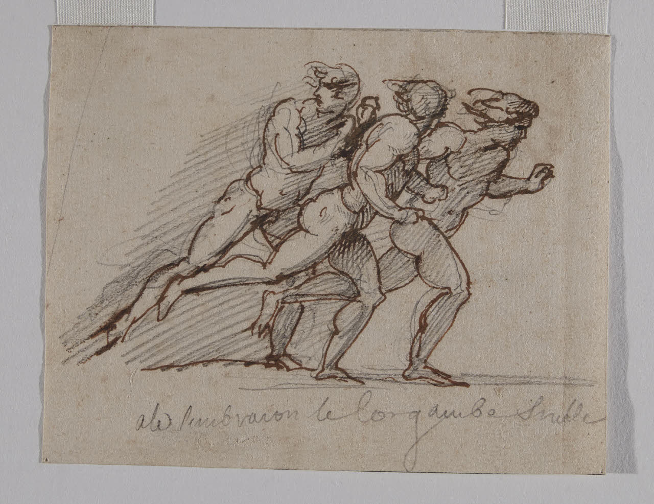 - NOTIZIE STORICO CRITICHE Il foglio, già attribuito ad Andrea Appiani da Giorgio Nicodemi (che accoglieva l'indicazione già espressa nella Guida di Mongeri del 1879), è da assegnare su base stilistica e sulla scorta del timbro a secco, a Giuseppe Bossi che di Dante fu studioso assiduo; una frequentazione, quella col poeta fiorentino, assente invece nel catalogo appianesco.\nIl soggetto è derivato dal Canto XVI dell'Inferno, in cui è narrato l'incontro del poeta e di Virgilio con i 3 sodomiti fiorentini all'interno del terzo girone del VII cerchio. Dante è colpito dalla velocità repentina con cui i tre dannati lo abbandonano per ricongiungersi alla selva dei peccatori da cui si erano staccati: "ale sembiaron le lor gambe snelle" (v. 87) è l'endecasillabo con cui descrive la prontezza dei personaggi. La citazione corrisponde alla lezione prevalente del testo nelle edizioni del tempo e ripresa anche nella Commedia stampata da Luigi Mussi nel 1809 con la collaborazione proprio di Luigi Bossi.\nBossi è molto bravo a tradurre visivamente il verso dantesco, trasmettendo, nel tratto veloce, il moto repentino dei sodomiti.\nProblematica appare l'iscrizione che accompagna l'immagine, poiché mostra una versione del testo dantesco che compare nei volumi a stampa solo a partire dal terzo decennio dell'Ottocento. E' possibile che si tratti di una aggiunta successiva, forse trascritta di getto per indicare il soggetto del disegno.