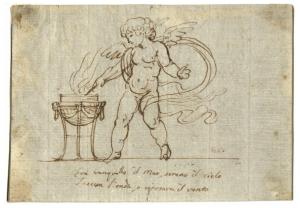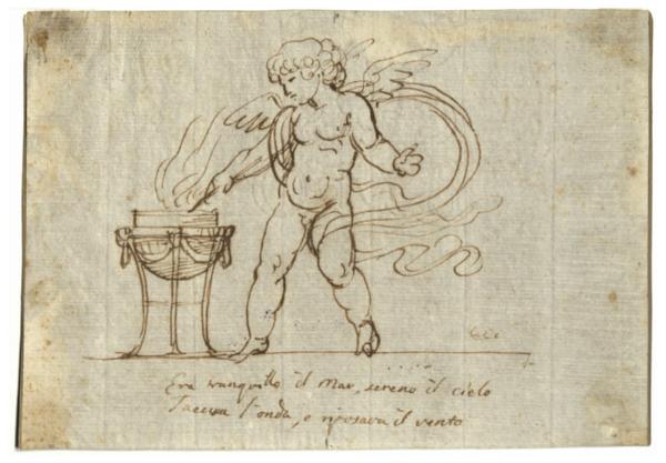 - NOTIZIE STORICO CRITICHE L'iscrizione che accompagna il disegno è derivata dalla prima ottava del terzo canto della Secchia Rapita di Alessandro Tassoni (1622). Non è chiara la correlazione fra la citazione tassonesca e il genietto che sembra nell'atto di accendere la propria fiaccola col tripode.\nIl poema godette di particolare fama alla fine del Settecento, quando venne messo in musica da Antonio Salieri (1772) e, ancora nell'ultimo decennio, da Nicola Antonio Zingarelli nel 1793 e da Francesco Bianchi nel 1794. E' possibile che il successo del libro possa aver indotto Appiani a una riflessione, sebbene la figura del genietto non compaia nel testo. L'artista, che conosceva l'editore parmense Giambattista Bodoni, avrebbe potuto ricevere un suggerimento da parte dello stesso tipografo e incisore - forse in occasione di uno degli incontri che portarono all'esecuzione del ritratto (1799; Parma, Galleria Nazionale) o in uno dei frequenti scambi epistolari - che non andò mai al di là di un semplice pensiero su carta.