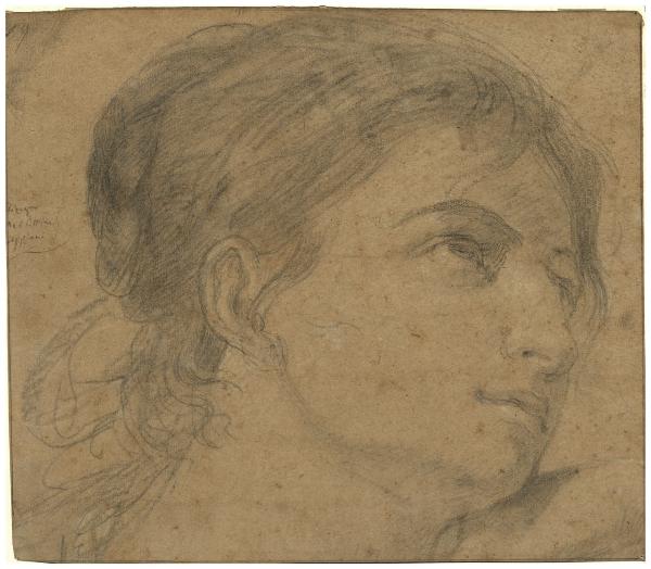- NOTIZIE STORICO CRITICHE Il disegno, che presenta un volto femminile ritratto di tre quarti e scorciato da sottinsù, è un notevole esempio dell'abilità di Appiani nella grafica.\nIl soggetto, trattato al pari di un ritratto, è definito con abbondanza di particolari e sviluppato con sottilissimi trapassi chiaroscurali, grazie al sapiente uso dello sfumato e del tratteggio e a lievissimi tocchi di biacca. Si può pensare che il foglio rappresenti la versione definitiva del lavoro, in vista della sua replica su tela, o più probabilmente, della trasposizione su cartone, destinato a un intervento decorativo complesso e di ampio respiro. Lo stesso viso scorciato, pensato per una visione dal basso, e l'espressione assorta della donna lasciano supporre che il personaggio fosse destinato a un affresco di tema mitologico.