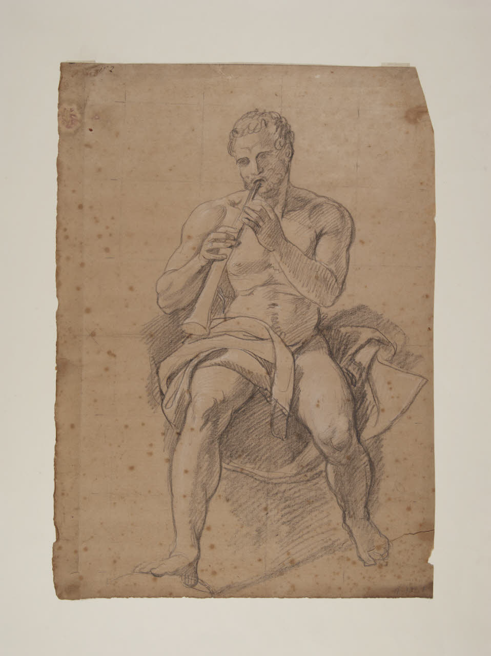 carta/ matita nera/ gesso bianco/ tracce di quadrettatura a matita nera