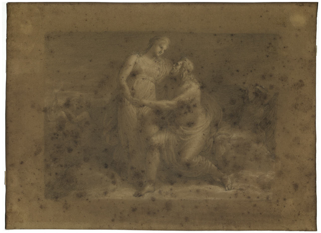 - NOTIZIE STORICO CRITICHE I quattro disegni sono tra loro strettamente collegati, come ha chiarito Francesco Leone (2015, pp. 120-121). I fogli, nei quali sono stati ravvisati accenni correggeschi e motivi desunti dalla coeva pittura di Proud'hon, si riferiscono a quattro tele che Appiani dipinse a Palazzo Reale a Milano, tra il 1810 e il 1812, per il gabinetto dell'imperatore (come attestato da una osservazione di Francesco Reina). Il ciclo mitologico doveva arricchire l'apparato decorativo dell'edificio; i particolari soggetti, legati a episodi derivati dalle vicende amorose di Giove e Giunone, e dalla loro successiva unione, legittimano l'ipotesi che fossero stati affidati ad Appiani in occasione delle nozze tra Napoleone e Maria Luisa d'Austria (1810). Le opere, nonostante il prestigio della commissione, ebbero una travagliata vicenda esecutiva (il Giove addormentato fu lasciato allo stadio di abbozzo) e una altrettanto travagliata storia collezionistica. I disegni preparatori, di alta qualità e portati a un estremo stadio di finitura attraverso un sapiente uso dello sfumato che accentua la sensazione che le figure emergano dallo sfondo, furono eseguiti probabilmente durante una fase intermedia del lavoro. Se il foglio con Giove abbraccia Giunone si rivela prossimo alla versione definitiva, le altre opere grafiche mostrano sostanziali differenze con la rispettiva controparte pittorica, soprattutto nell'impaginazione delle scene, caratterizzate da una ricercatezza nei dettagli classicheggianti dell'abbigliamento e degli arredi, particolari quasi totalmente assenti nelle prove grafiche. I soggetti risultano così meno strutturati e complessi, meno affollati, quasi essenziali nello sviluppo dell'azione.