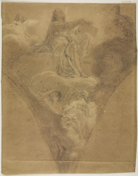 - NOTIZIE STORICO CRITICHE Il disegno, caratterizzato dall'attenta resa luministica e da una coerente impaginazione dello spazio, va considerato una prima idea per il san Giovanni Evangelista affrescato in uno dei pennacchi della cupola di Santa Maria presso San Celso nel 1793. La struttura della scena differisce dalla decorazione finale. La monumentalità dell'evangelista appare ridimensionata; il moto ascensionale, pur evidente, è meno accentuato in virtù di una composizione meno serrata. È possibile riconoscere nel disegno uno studio approntato da Appiani per analizzare l'effetto d'insieme; in questa fase l'attenzione riservata dall'autore alla figura dell'evangelista, fortemente caratterizzata e animata da una profonda carica emozionale, alla ricerca dell'ispirazione divina, prevale sull'equilibrio compositivo, raggiunto comunque nella bilanciata struttura della scena affrescata.