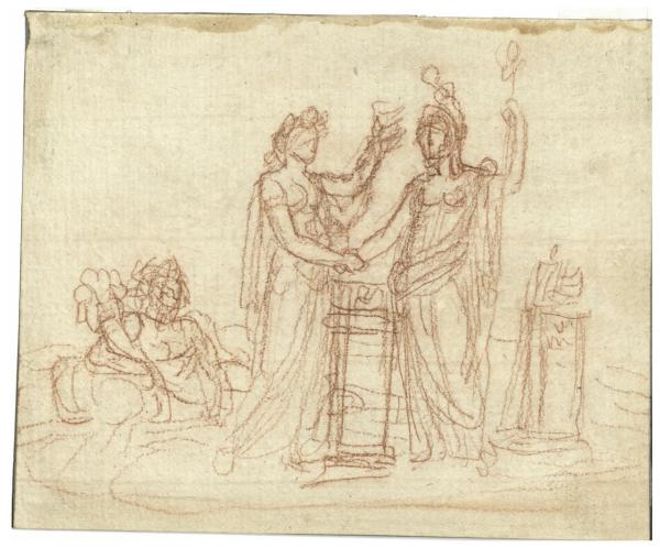 - NOTIZIE STORICO CRITICHE Il disegno, come riconosciuto da Precerutti e ulteriormente chiarito da Gennari e Sannazzaro, costituisce un veloce studio preliminare per l'intestazione della carta del Direttorio Esecutivo della Repubblica Cisalpina, genere con finalità propagandistiche e politiche a cui Appiani si dedicò con costanza. Le figure, qui solo abbozzate, possono essere identificate solo attraverso l'incisione finale. Al centro, le personificazioni della Repubblica cisalpina e della Repubblica francese, identificate dai rispettivi simboli (entrambe abbigliate all'antica, la Repubblica cisalpina indossa una corona di fiori, la Francia è cinta da un elmo piumato e reca una lancia su cui è trattenuto il berretto frigio) si stringono la mano sopra un'ara. Alle loro spalle, a sinistra, la figura di un vecchio adagiato a terra che reca una cornucopia, chiara personificazione del fiume Po. A destra, un piccolo altare o, forse, un fascio littorio, come parrebbe essere confermato dalla stampa, a cui si appoggia un genietto alato assente nell'abbozzo milanese.