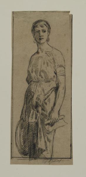 - NOTIZIE STORICO CRITICHE Il disegno, appartenuto alla collezione di Pompeo Mariani, risulta essere uno studio preparatorio in controparte per Erodiade, incisione ascritta a Gioacchino Banfi dalla Mezzetti (cfr. Mezzetti 1935, p. 121, n. 11) eseguita dopo il 1878, anno in cui l'artista trattò il medesimo soggetto in pittura con un olio su tela (Pinacoteca di Brera. Dipinti dell'Ottocento e del Novecento. Collezioni dell'Accademia e della Pinacoteca, tomo I, Milano 1993, p. 74, n. 67). Il foglio in esame riproduce la figura stante di una donna, con il capo visto frontalmente e il corpo ripreso per tre quarti verso destra, mentre tiene in una mano il vassoio sul quale verrà poi presentata da Salomé al re Erode Antipa la testa decollata di San Giovanni Battista. Questa figura biblica è immaginata da Banfi nella sua alterigia e sensualità al tempo stesso.