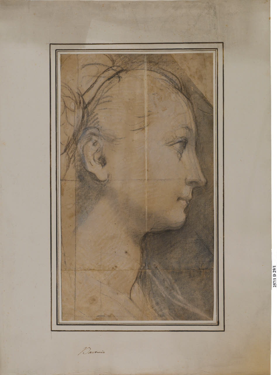 - NOTIZIE STORICO CRITICHE Proveniente dalla raccolta di Alberico XII Barbiano di Belgioioso, questo studio di testa femminile di profilo verso destra entrò nei musei civici nel 1943 con un'antica attribuzione manoscritta di Giuseppe Bossi che lo ascriveva al pittore urbinate Federico Barocci sul montaggio dell'opera. Il cartonetto in esame, eseguito a matita nera e carboncino con lumeggiature di gessetto bianco, è inoltre quadrettato con i contorni incisi e risulta essere preparatorio per una della figure che compaiono nella pala della Madonna del Popolo, dipinta dal Barocci tra il 1575 e il 1579 per la Confraternità dei Laici di Arezzo. La prima commissione di quest'opera venne affidata al Vasari ma la sua morte, avvenuta il 27 giugno del 1574, aveva messo i confratelli nella necessità di rivolgersi ad un altro artista e la scelta ricadde su Federico Barocci. Il 30 ottobre del 1574 il rettore della Pia Contraternita dei Laici di Santa Maria della Misericordia incaricò ufficialmente Barocci, il quale, comprendendo l'importanza della commissione, rispose con immediata solerzia. Tuttavia, l'esecuzione del dipinto occupò diversi anni l'artista, come dimostrano il carteggio con i committenti e i numerosi disegni preparatori conservati fra gli altri presso il British Museum, il Gabinetto dei disegni e delle stampe degli Uffizi e il Kupferstichkabinett di Berlino, pervenuti sino a noi (cfr. Mostra di Federico Barocci 1975, pp. 106-118; A. Emiliani, Federico Barocci, 2008, vol.I, pp. 310-349). Questi ultimi testimoniano l'iter creativo del Barocci che al «misterio della misericordia» preferì rappresentare un tema più libero e moderno, con il popolo che si rivolge a Maria, la quale a sua volta intercede presso Cristo benedicente. La parte inferiore della tavola è occupata da una moltitudine di figure di diversa estrazione sociale, in cui si possono riconoscere ricche gentildonne ingioiellate e in preghiera, poveri che ricevono l'elemosina, musici storpi e bambini. In particolare, il cartonetto del Castello Sforzesco è preparatorio per la figura della ieratica nobildonna inginocchiata di profilo sulla sinistra disturbata da un monello che sfoglia senza reverenza il libro di preghiere che lei tiene in mano. I lineamenti di questa figura femminile di profilo e con la medesima acconciatura raccolta sulla nuca con un nastro si ritrovano anche nella Vergine della Visitazione, dipinta tra il 1583 e il 1586 per la Chiesa Nuova di Roma, lasciando ipotizzare che si tratti della stessa modella immortalata dal maestro.