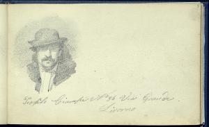 Ritratto a mezzobusto di uomo barbuto con cappello visto frontalmente
