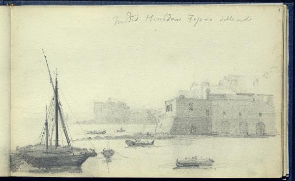 Porto di mare con fortificazioni, un veliero e diverse imbarcazioni