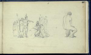Schizzo di una scena storica e studio accademico di un nudo maschile di spalle