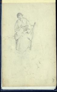 Donna brianzola seduta con un bimbo in grembo e schizzi poco leggibili