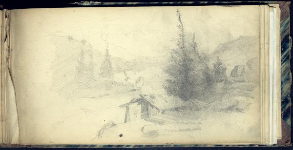 Paesaggio montuoso con un casolare e alberi