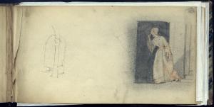 Abbozzo di un particolare architettonico e figuretta femminile alla porta in atto di zittire