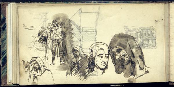 Particolari architettonici e teste e figurette maschili e femminili