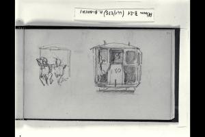 Abbozzo di un tram a cavalli con cavalli in corsa e parte posteriore del mezzo di trasporto