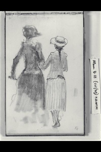 Signora e fanciulla a braccetto viste di tergo