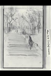 Figuretta in atto di salire una scalinata immersa tra gli alberi