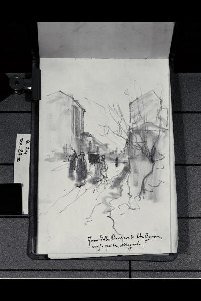 Strada urbana con macchiette fuori della Barriera di Porta Genova verso Porta Magenta