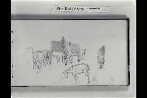 Sosta di vetture pubbliche chiuse, schizzo di un cavallo e di una figuretta femminile