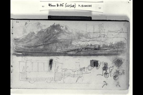 Paesaggio montuoso. Tranvai a cavalli. Vettura pubblica chiusa