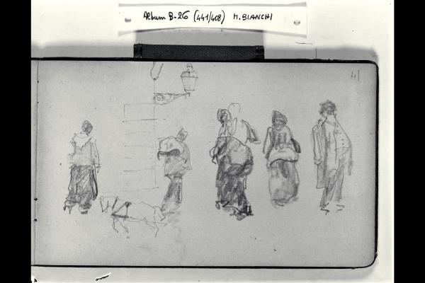 Strada con figurette maschili e femminili e schizzo di un cavallo