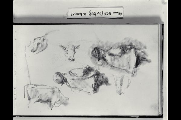 Schizzi di una figura di contadinello, due testine di vitello e abbozzo di un bovino