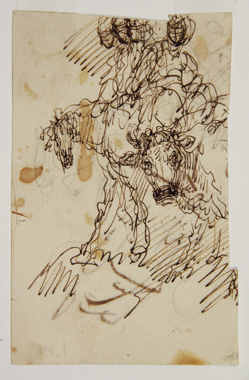 Due uomini a cavallo e testa di bovino. Due uomini a cavallo e testa di bovino
