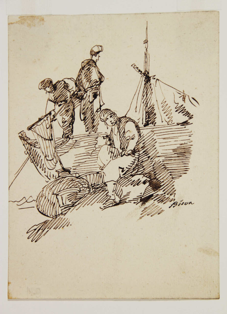 Una barca da pesca con due pescatori, e figura maschile seduta sopra un masso. Una barca da pesca con due pescatori, e figura maschile seduta sopra un masso