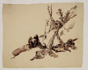 Due figure sedute su un muricciolo di un ponte vicino a un casolare diroccato. Due figure sedute su un muricciolo di un ponte vicino a un casolare diroccato