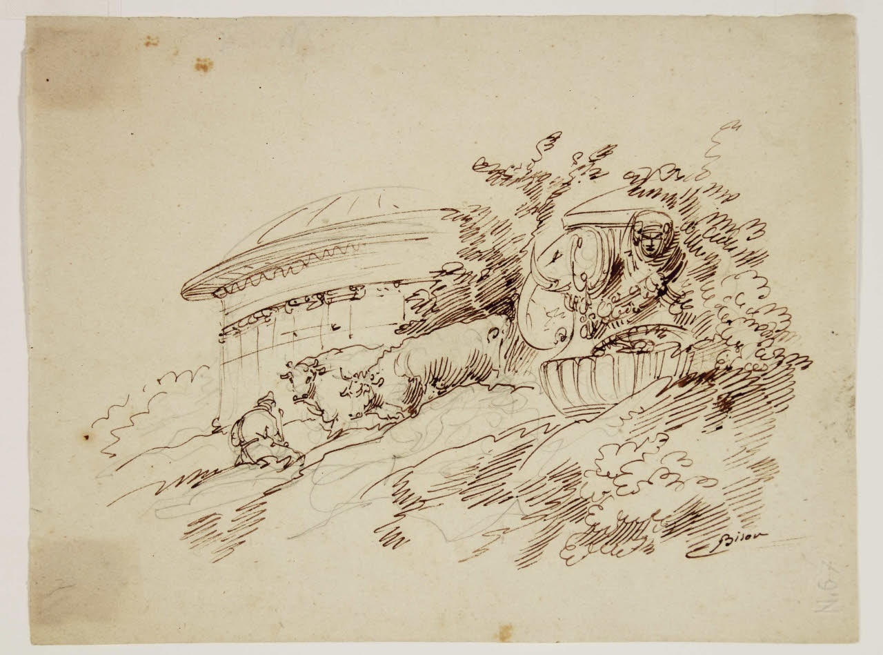 Mandriano con due bovini seduto in un paesaggio con monumento decorativo e un tempio rotondo nello sfondo. Mandriano con due bovini seduto in un paesaggio con monumento decorativo e un tempio rotondo nello sfondo