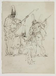 Tre figure maschili mascherate con strumenti musicali. Tre figure maschili mascherate con strumenti musicali