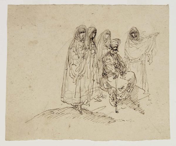 Figura maschile seduta con turbante attorniata da quattro donne. Figura maschile seduta con turbante attorniata da quattro donne