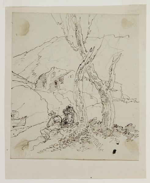 Paesaggio di montagna con casolari e tre figure sedute ai piedi di due alberi spogli. Paesaggio di montagna con casolari e tre figure sedute ai piedi di due alberi spogli