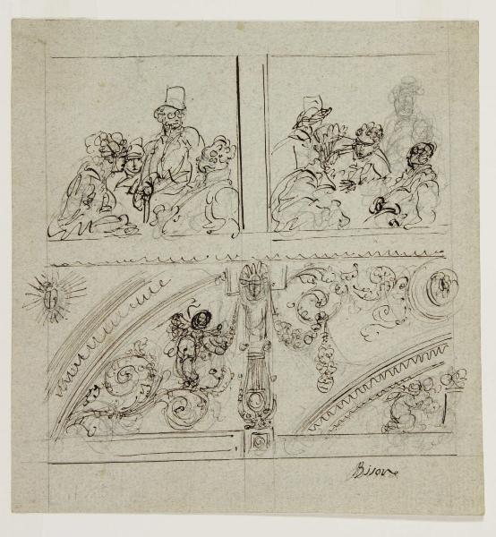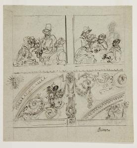 Studi di due gruppi di figure e particolari decorativi. Studi di due gruppi di figure e particolari decorativi