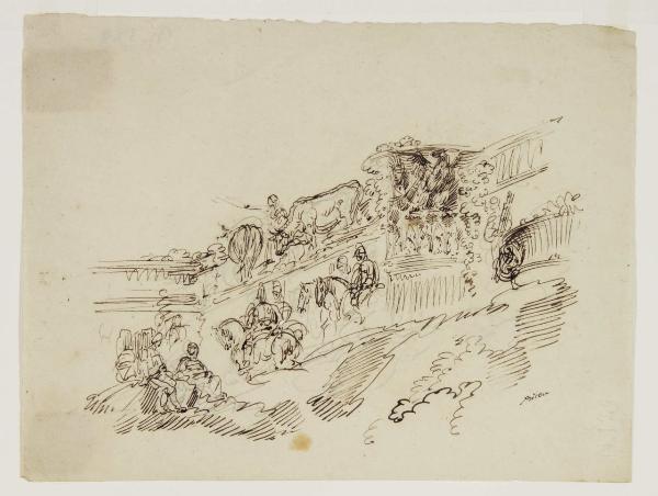 Composizione con figurette a cavallo, macchiette sedute, un'aquila e bovini. Composizione con figurette a cavallo, macchiette sedute, un'aquila e bovini