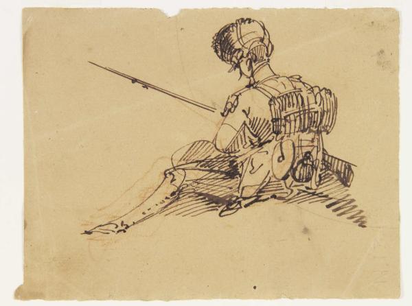 Soldato seduto e armato di fucile ritratto di spalle. Soldato seduto e armato di fucile ritratto di spalle