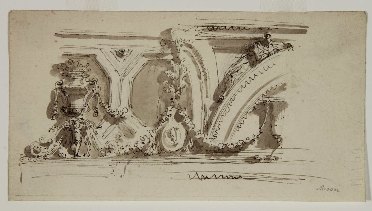 Particolare decorativo con sculture, vasi e festoni floreali. Particolare decorativo con sculture, vasi e festoni floreali