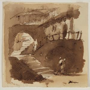Veduta di paese con una scalinata e una macchietta. Veduta di paese con una scalinata e una macchietta