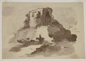 Paesaggio con macchiete e un rilievo sovrastato da un edificio. Paesaggio con macchiete e un rilievo sovrastato da un edificio