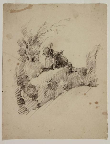 Particolare di paesaggio roccioso con due figure di contadini stanti. Particolare di paesaggio roccioso con due figure di contadini stanti